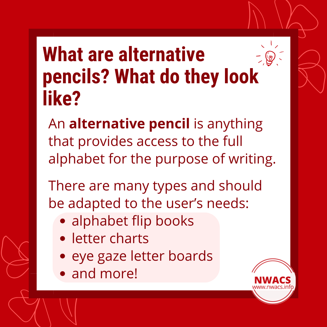When we talk about writing, we do not mean handwriting. We mean expressing ideas and thoughts in literary form (e.g., notes, blogs, emails, texts, articles, etc.). While some learners can use handwriting to write, not all can. Some learners need alternative pencils. Alternative pencils are writing tools designed for people who are unable to hold traditional writing tools (such as a pen/pencil) or physically use a standard keyboard. An alternative pencil is anything that provides a learner with access to all letters of the alphabet for the purpose of constructing text.